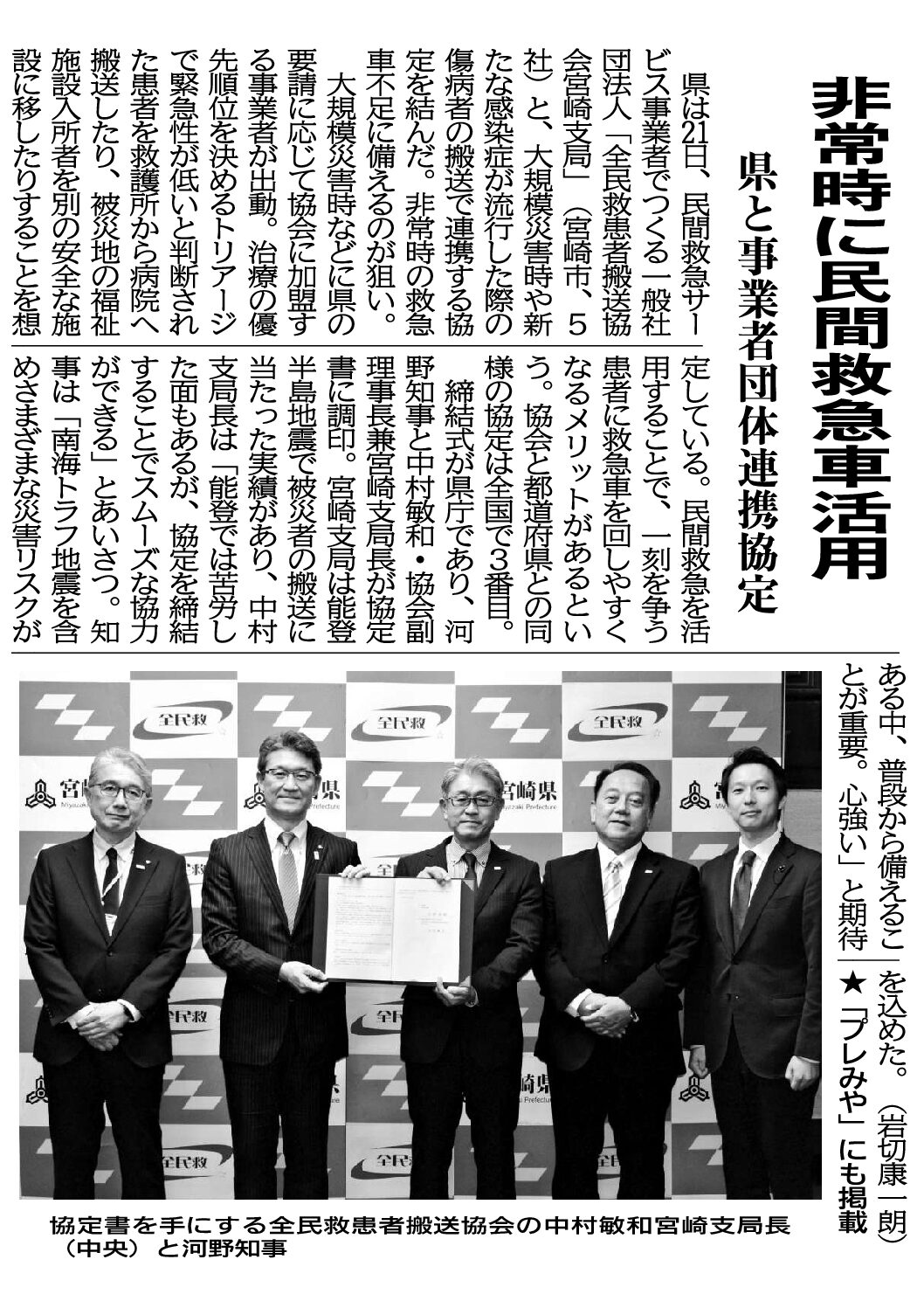 令和7年4月21日、宮崎県庁にて全民救患者搬送協会宮崎支部と「大規模災害時及び新興・再興感染症まん延時における傷病者等の搬送に関する協定」を河野宮崎県知事と中村敏和宮崎支局長が協定書に署名し無事に締結致しました。